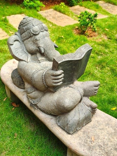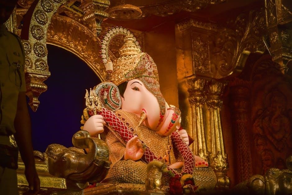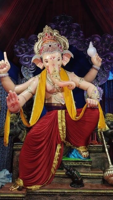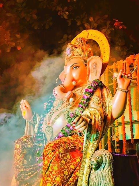 PDF versions frequently emphasize Ganesha’s large belly, symbolizing his capacity to digest the sorrows of his devotees. His elephant head signifies wisdom and discrimination. The text portrays him as the lord of beginnings, remover of obstacles, and bestower of success.
