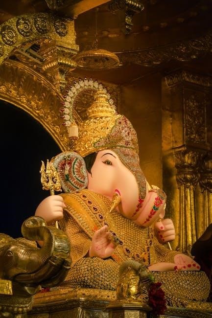 The Ganapati Atharvashirsha, often found as a downloadable PDF, begins with “Aum Gam,” followed by a detailed description of Lord Ganesha and recitation benefits.